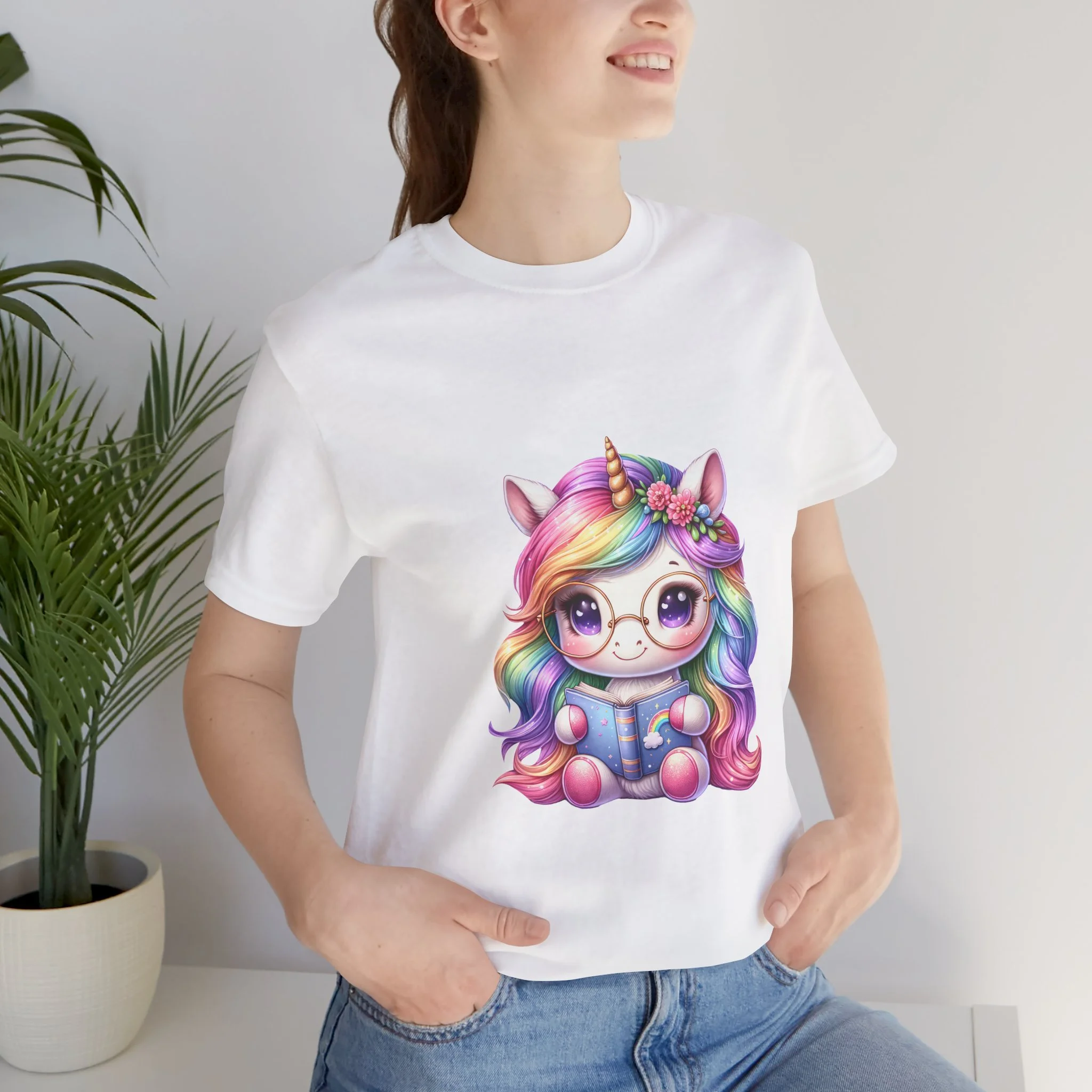 Imagine a whimsical t-shirt featuring a serene unicorn nestled comfortably beneath a sprawling tree, its glossy mane cascading in pastel hues of pink, blue, and lavender. The unicorn's gentle eyes are intently focused on an open book, its pages alive with the promise of adventure and knowledge. The book seems to glow with a magical aura, hinting at tales of distant lands and mythical creatures. Surrounding the unicorn are delicate flowers and fluttering butterflies, adding a touch of enchantment to the scene. Above, in elegant script, the phrase "Lost in a Good Book" captures the essence of this magical moment. This t-shirt design is a perfect blend of fantasy and literary charm, ideal for dreamers and book lovers alike.