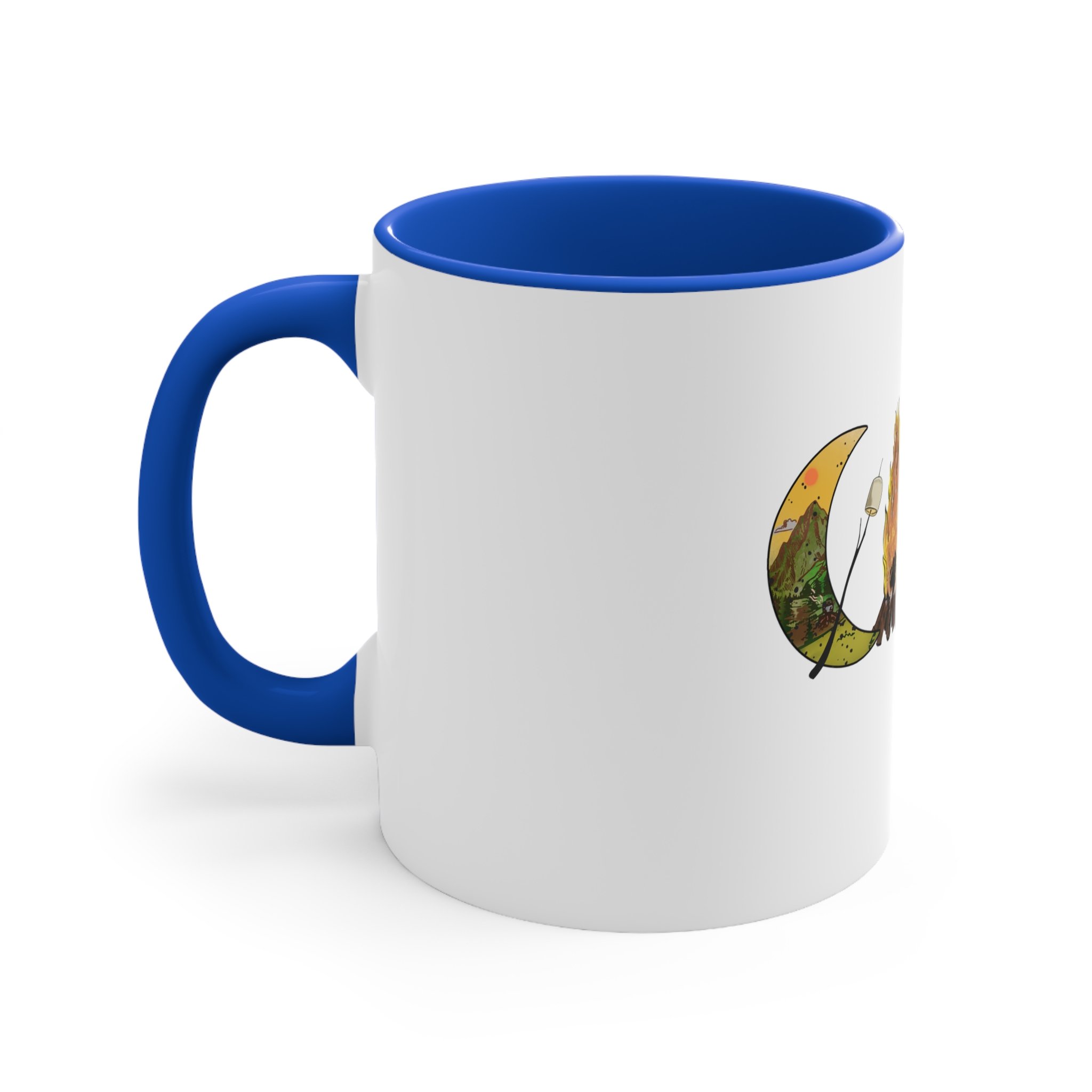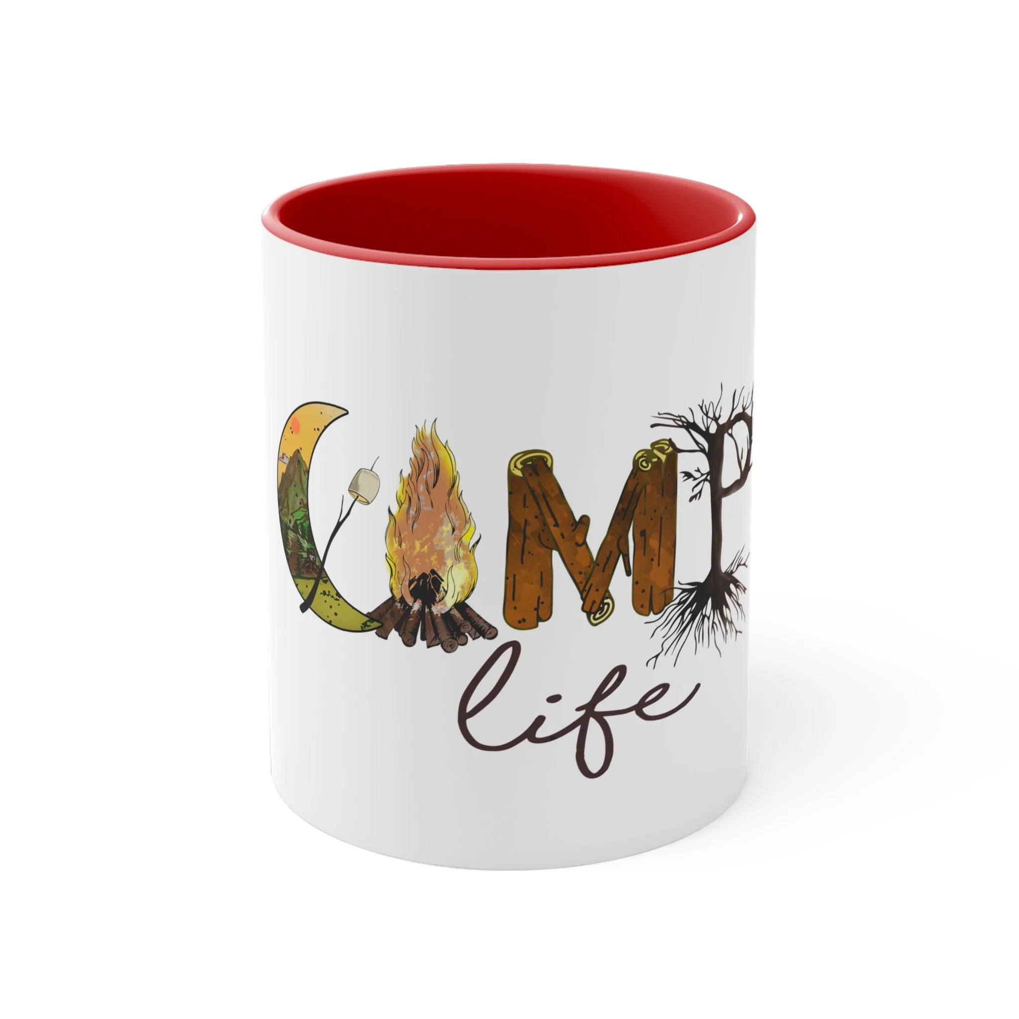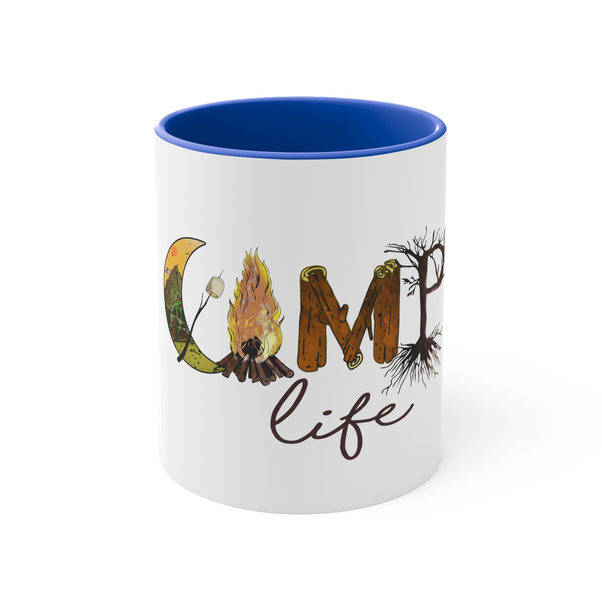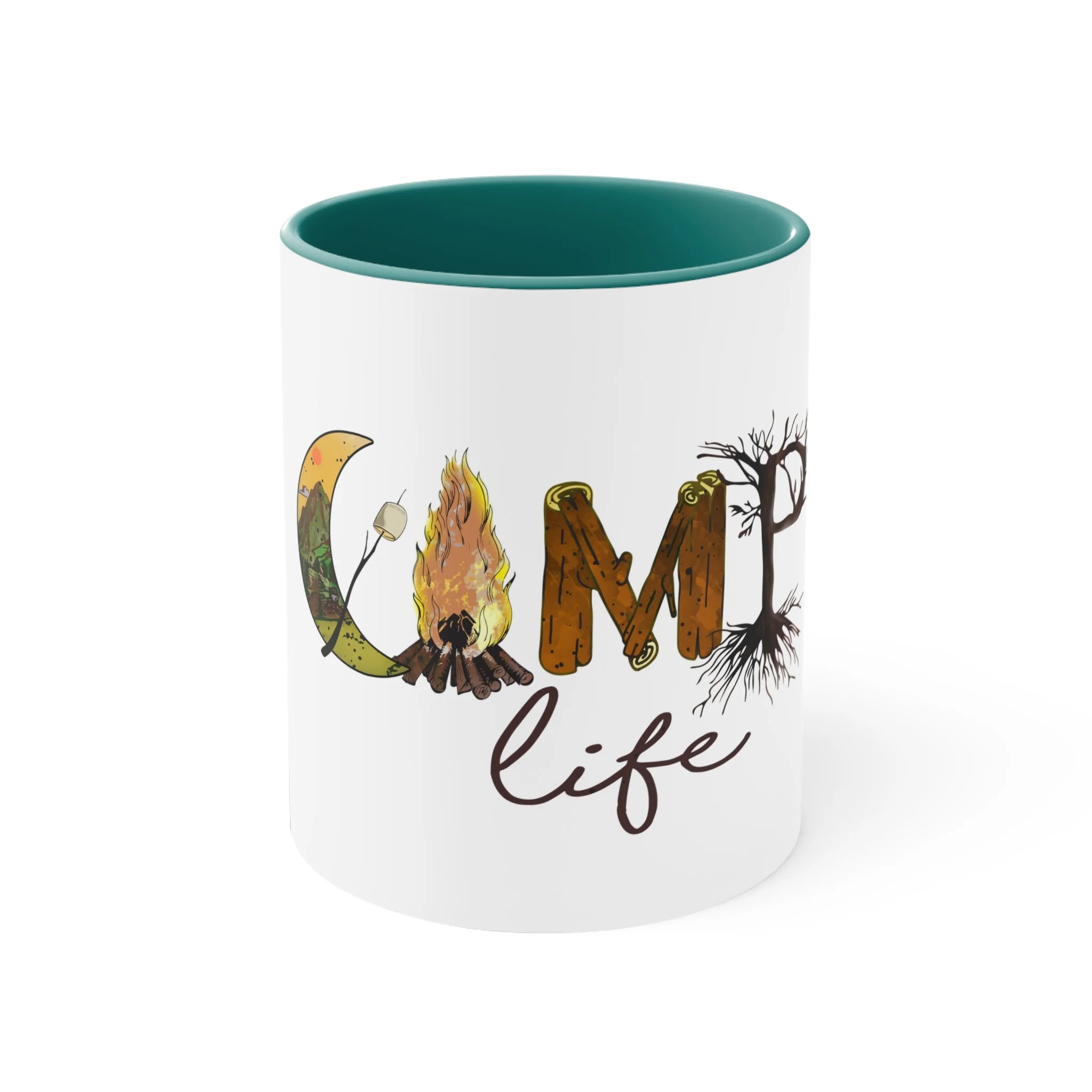 The colorful mug features a vibrant design that captures the essence of "Camp Life" with a blend of nature-inspired imagery and playful typography. Against a backdrop of lush green trees and a serene blue lake, the words "Camp Life" are artistically scrawled in bold, cheerful lettering. Tiny illustrations of tents, campfires, and starry skies are scattered around, evoking memories of evenings spent under the open sky. The mug's bright hues and whimsical design invite a sense of adventure and relaxation, perfect for sipping your favorite beverage while reminiscing about outdoor escapades. Whether you're a seasoned camper or a nature enthusiast, this mug embodies the spirit of outdoor joy and camaraderie.