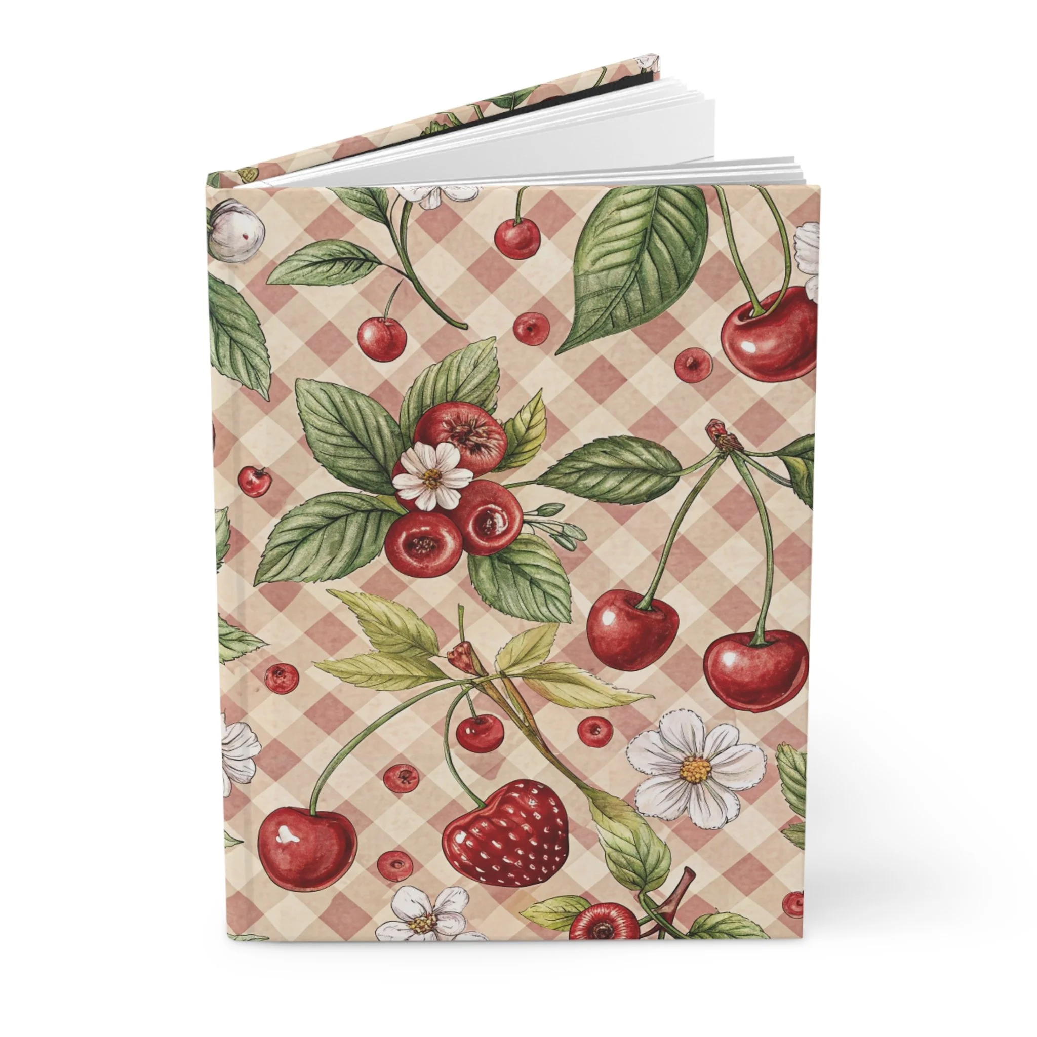This hardcover journal brings a warm, vintage picnic feel to everyday note-taking. Soft matte lamination and full-wrap artwork showcase hand-painted cherries, strawberries, and blooms set against a cozy gingham background. The sewn casewrap binding lets the book lie comfortably open while 150 lined pages record thoughts, recipes, lists, and plans. Perforated sheets make it simple to remove pages without damaging the rest of the journal. Bright, crisp printing keeps the fruit-and-floral colors lively over time, while the understated matte finish keeps reflections low and the artwork tactile. A small production barcode appears on the back cover.