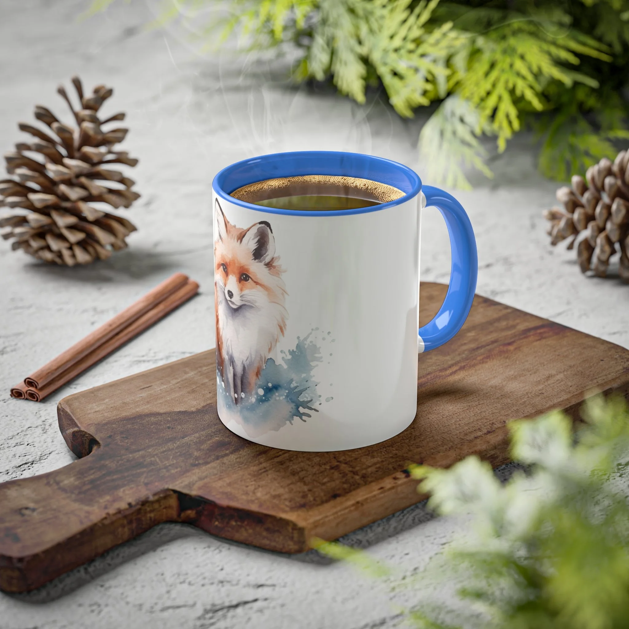 The watercolor fox on the color mug is a charming depiction of nature's clever and curious creature, brought to life with the delicate and fluid technique of watercolor painting. The fox, portrayed with a palette of warm oranges, subtle reds, and soft browns, seems almost to leap off the mug's surface, its fur rendered in gentle, translucent layers that capture the light beautifully. The artist has skillfully blended shades to create a sense of depth and texture, while the fox's eyes, painted with precision, convey a sense of intelligence and playfulness. The background, a wash of gentle greens and blues, complements the fox's vibrant hues, creating a harmonious and eye-catching design. This mug transforms a simple piece of drinkware into a work of art, making every sip of your favorite beverage a delightful experience.