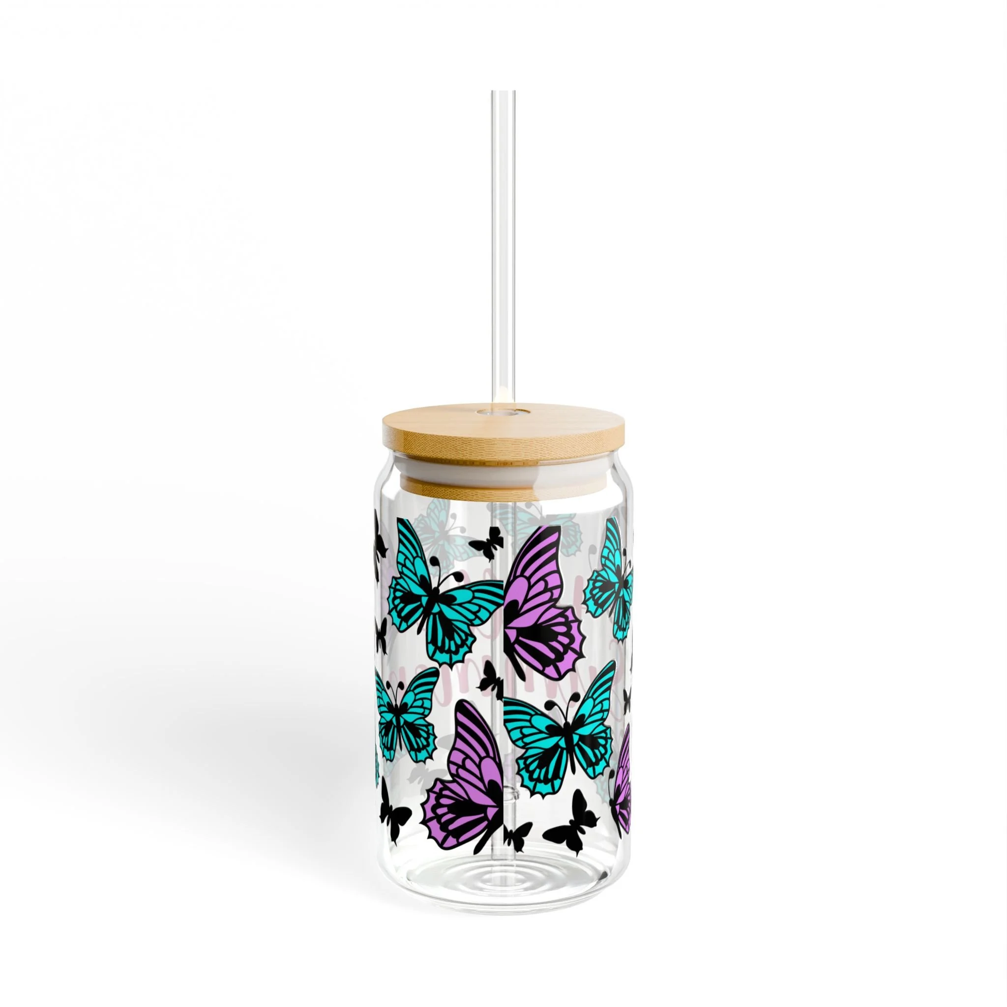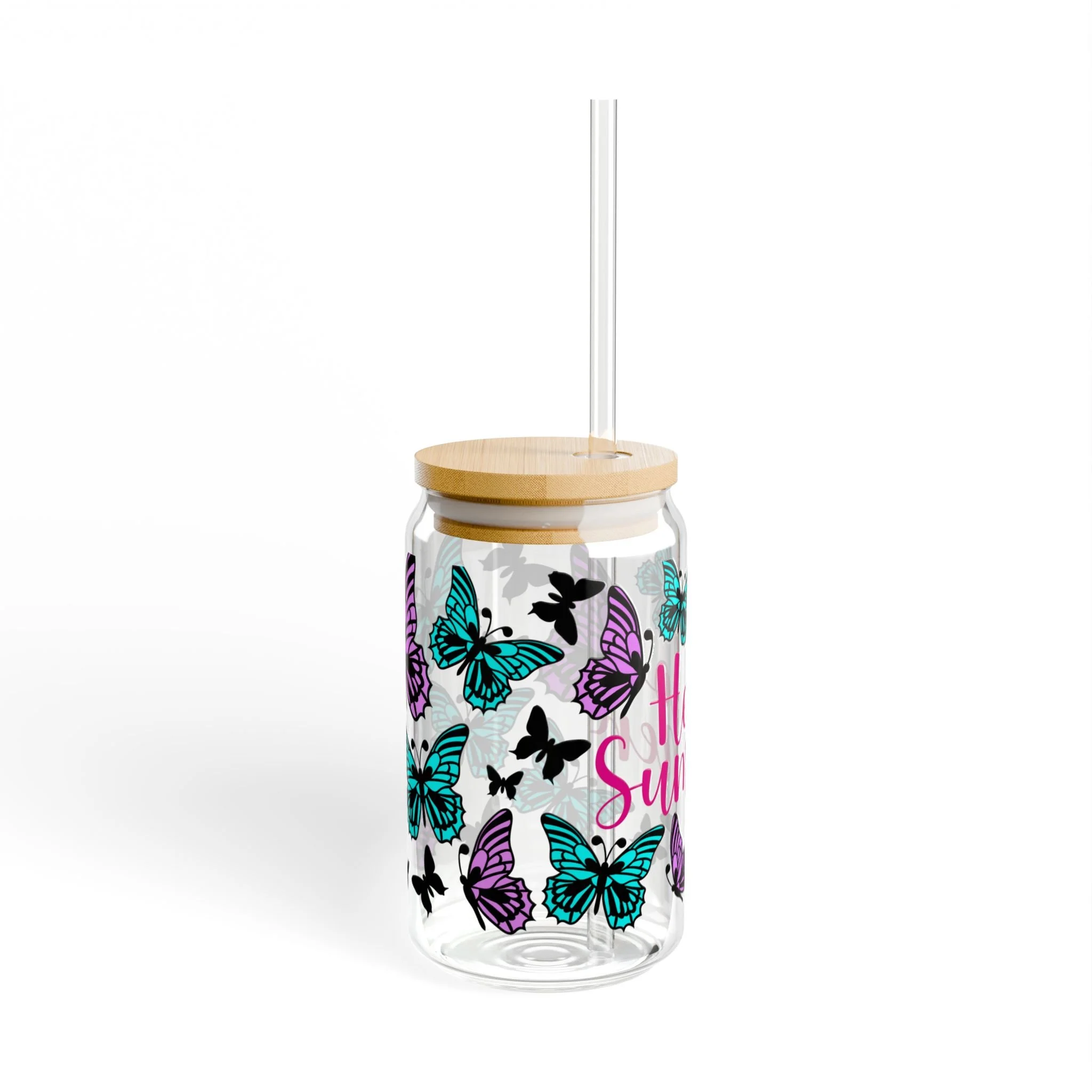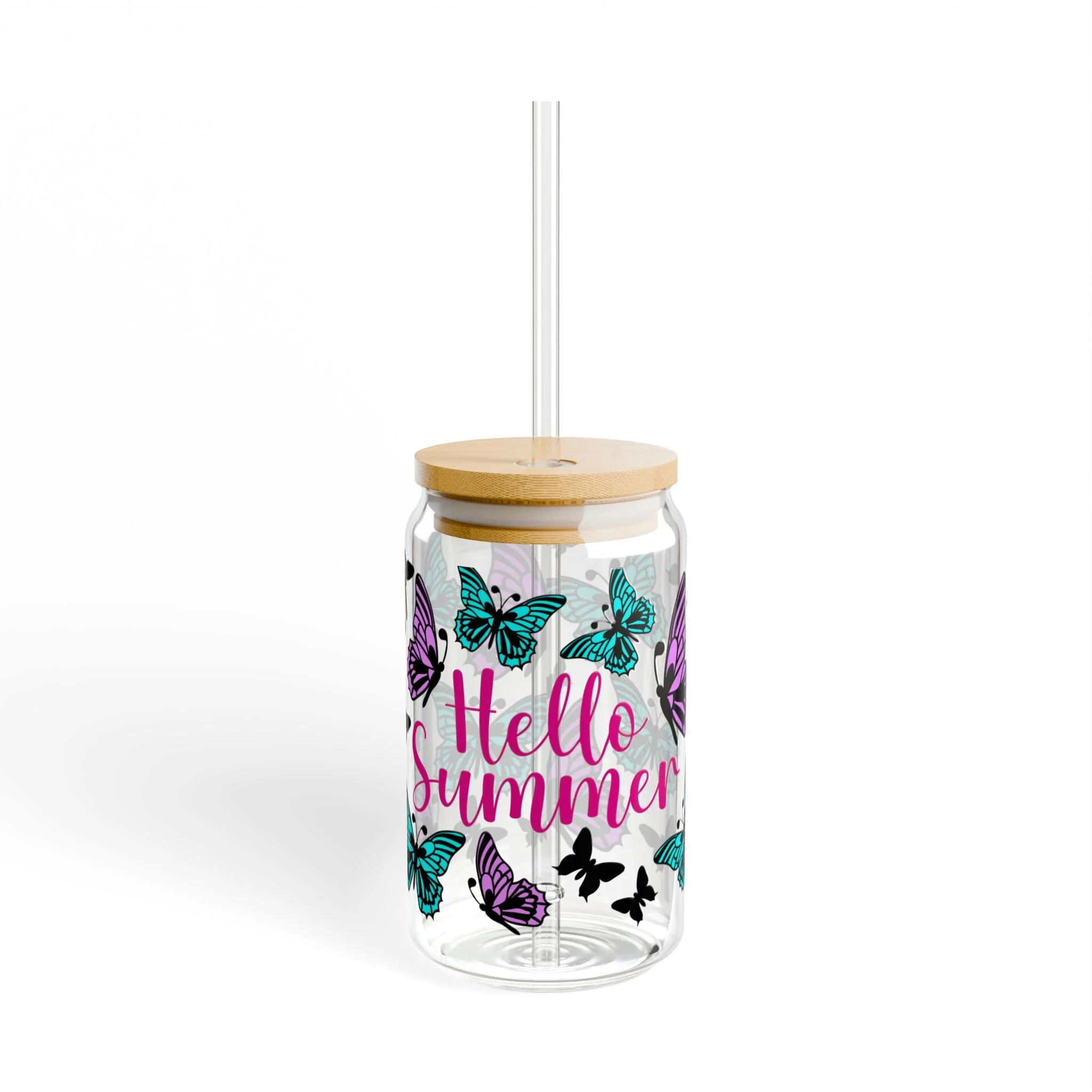 Hello Summer Butterfly Sipper Glass – 16oz Clear Tumbler with Straw