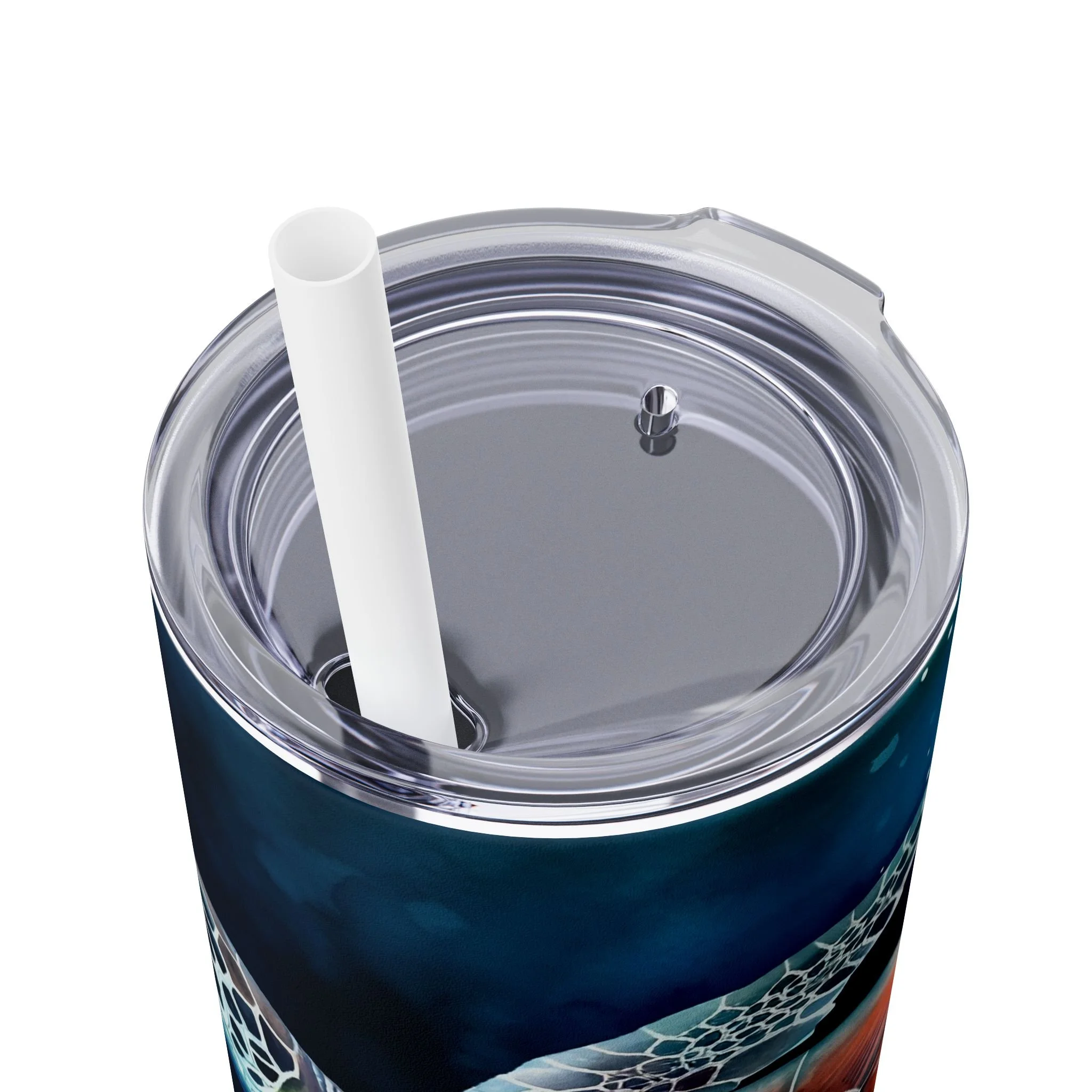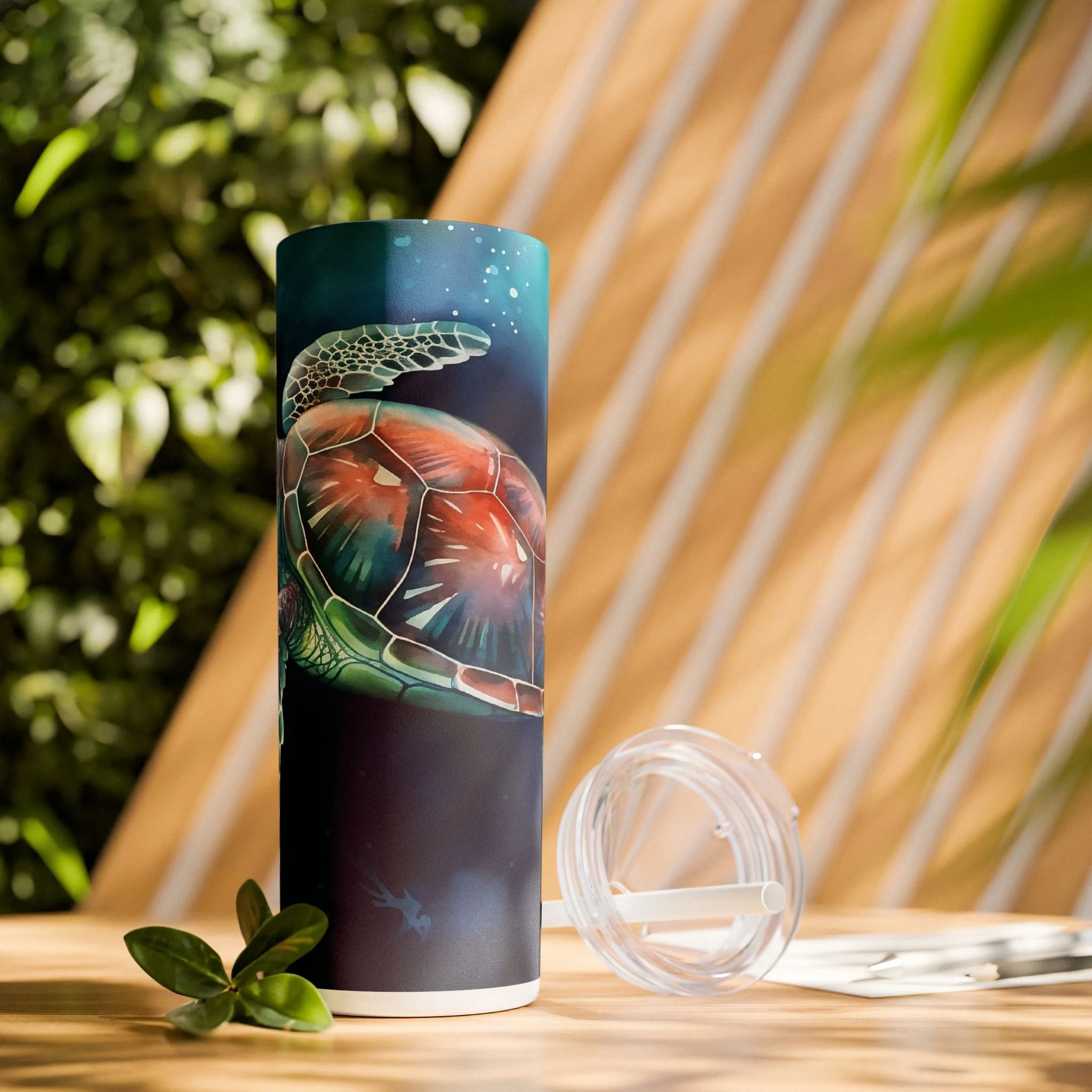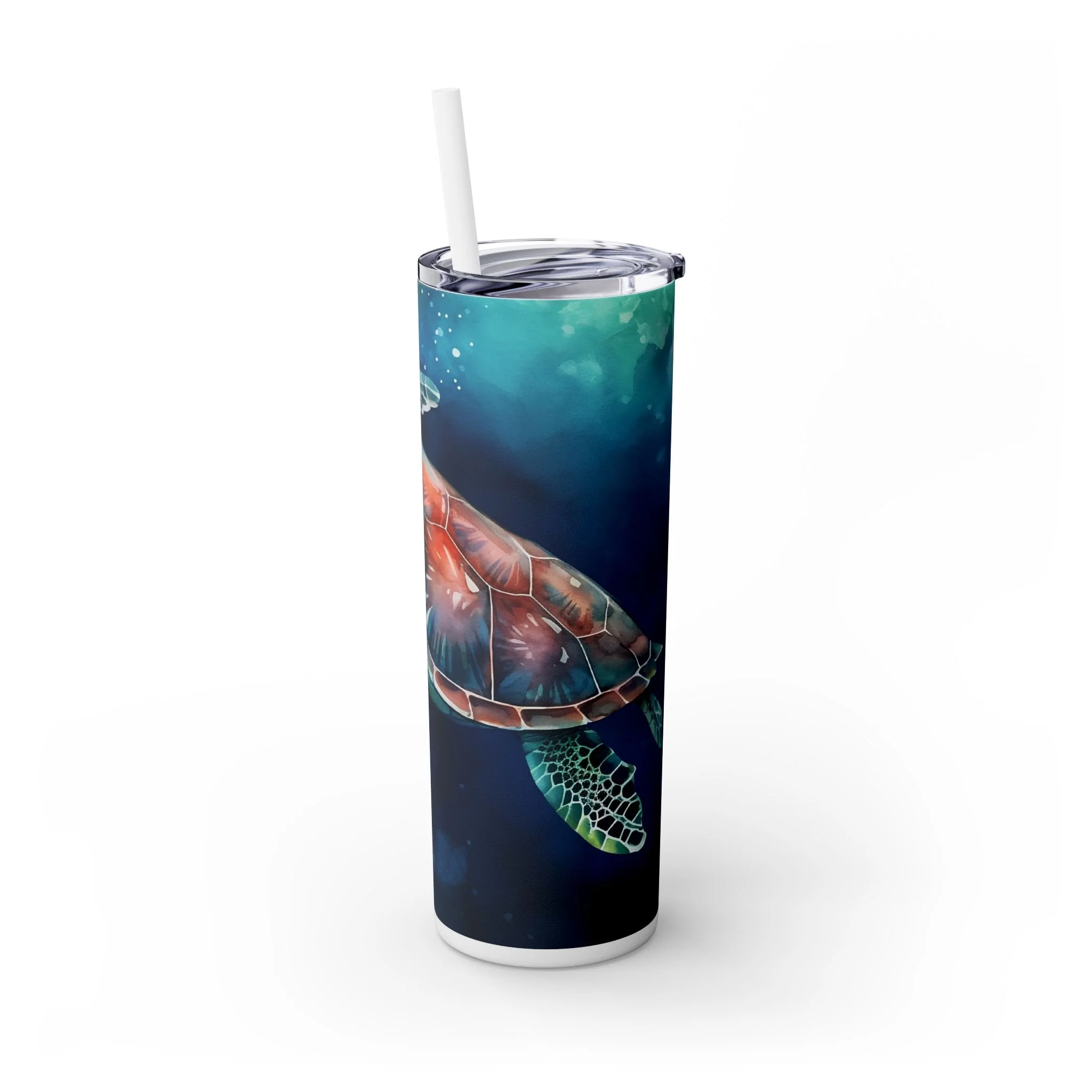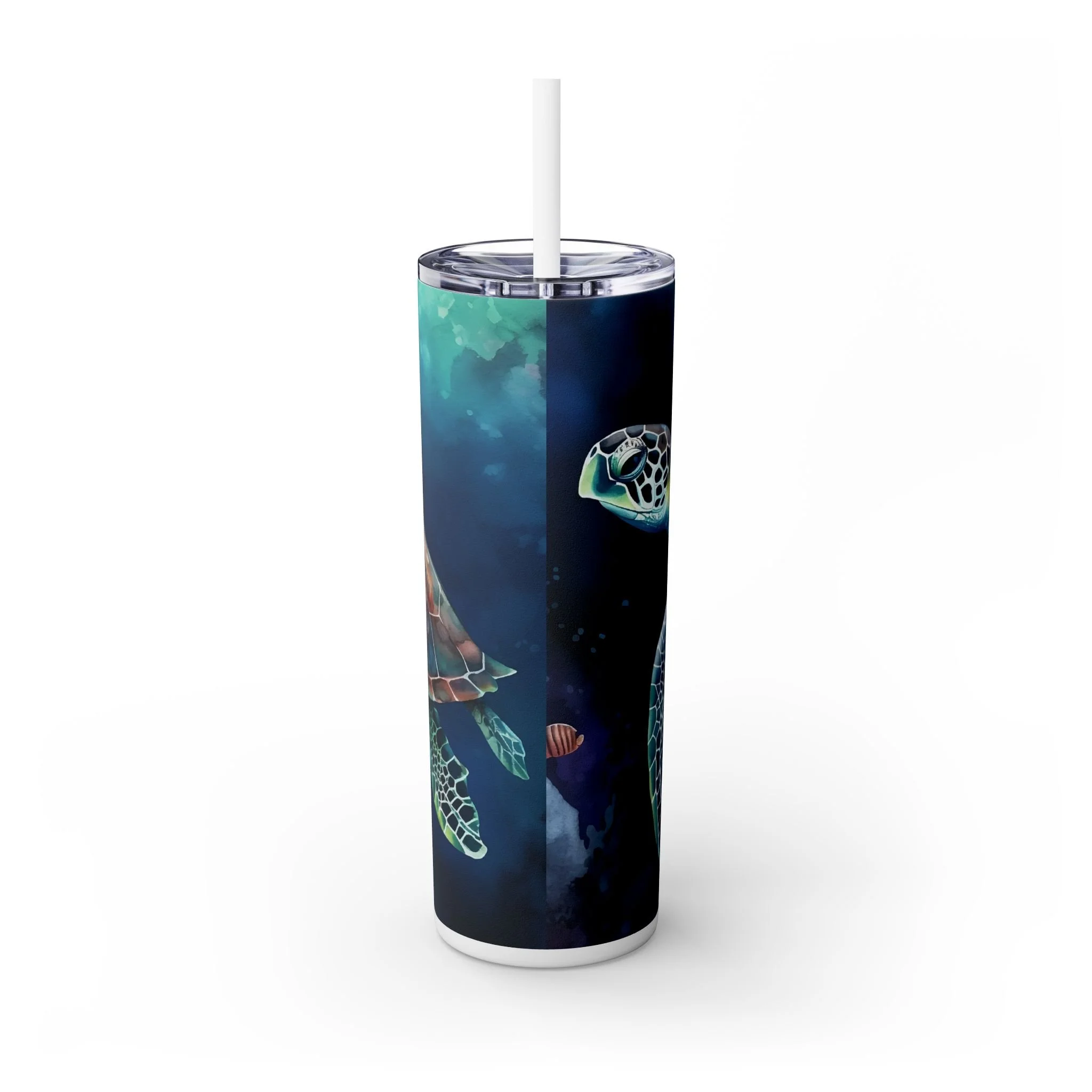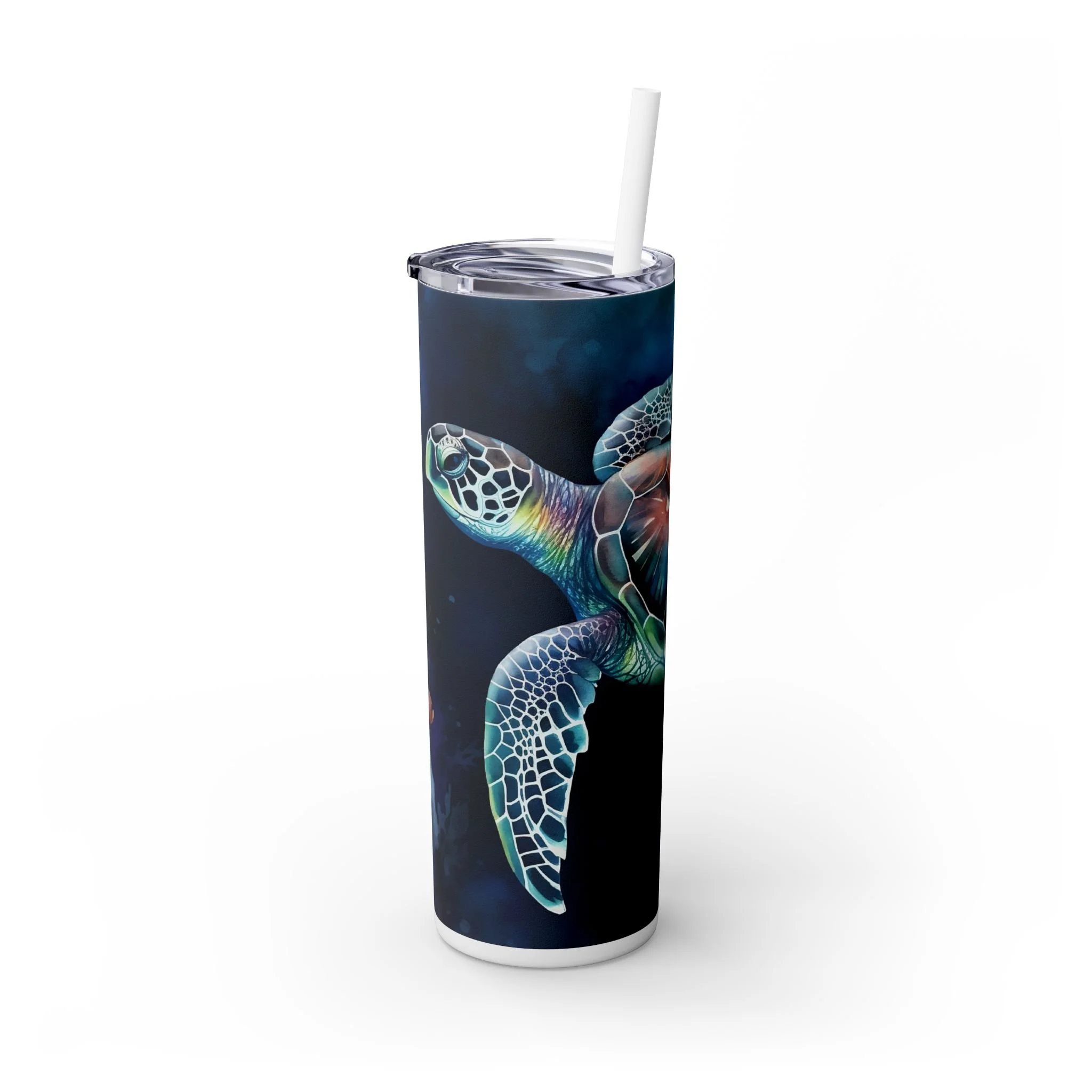 Sip slowly and let the sea follow you. This slim 20oz tumbler carries a luminous sea turtle gliding through deep, ink-blue waters — colors that pop with modern printing on a matte-printed wrap. The tapered, double-wall stainless steel body fits cup holders and hands alike, while the clear press-on lid and matching straw make it easy to take your cold brew, iced tea, or morning smoothie on the move. Designed for days when you want to feel salt air and calm currents, it keeps cold drinks chilled for a full day and holds warmth for hours when you need it. Hand wash only; built to be carried to beach walks, studio sessions, or quiet commutes where small, beautiful details matter.