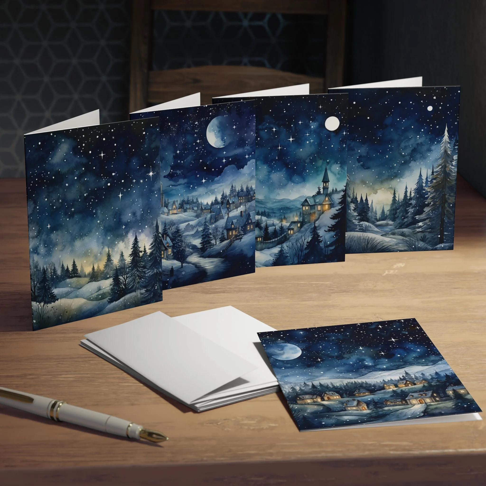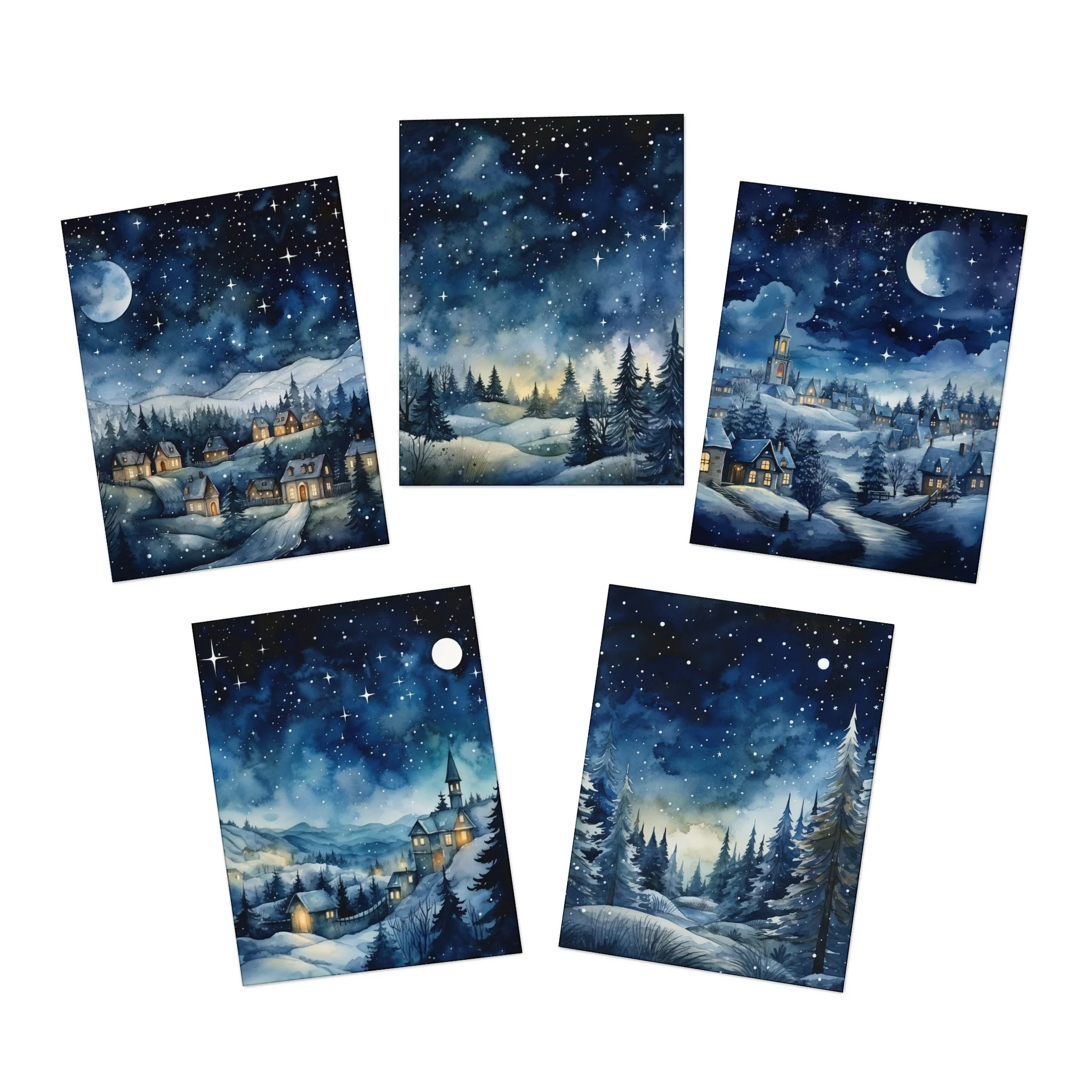 The Snowy Covered Village Cards (5-Pack) set features five beautifully illustrated greeting cards, each capturing the serene and enchanting ambiance of a village blanketed in freshly fallen snow. The artwork on the front of each card depicts charming cottages with smoke gently rising from their chimneys, surrounded by snow-laden trees and twinkling lights that evoke the magic of the winter season. The interior of these high-quality, durable cards is left blank, providing ample space for you to pen personalized messages, whether for holiday greetings, heartfelt notes, or any occasion that calls for a touch of winter wonder. Perfect for spreading warmth and joy, these cards are a delightful way to connect with loved ones during the colder months.