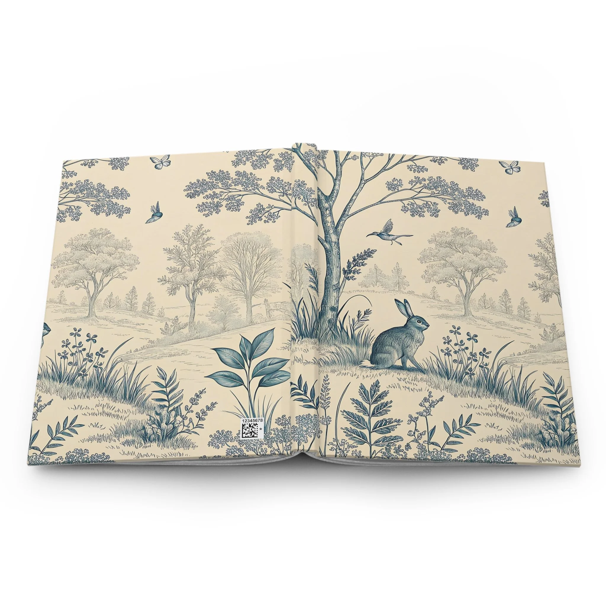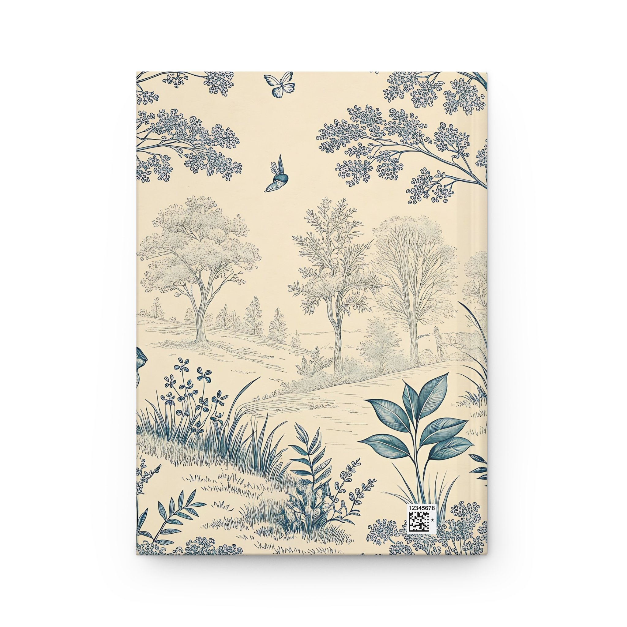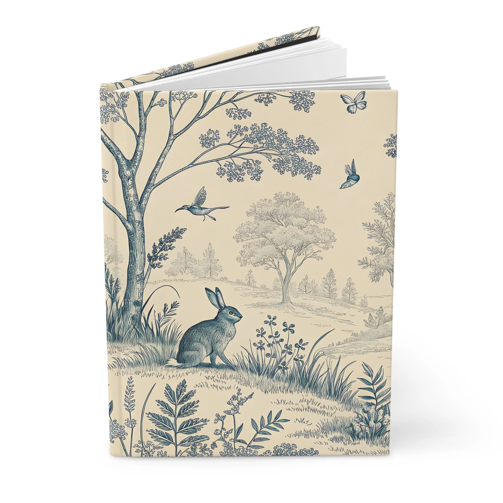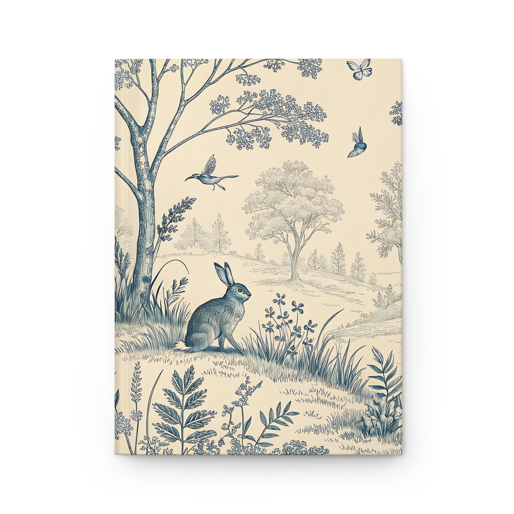 Soft as a remembered afternoon in the country, this hardcover journal wraps your thoughts in a quiet, vintage landscape. Gentle blue illustrations—bunnies, birds, and rolling trees—flow across the matte cover, inviting slow, deliberate writing. The sewn casewrap binding lets the book open flat and travel with you without breaking its spine. Inside, 150 lined pages with perforations give space for steady journaling, lists, sketches or letters you might want to share. The muted cream background and delicate botanical details create a calm pause on your shelf or in your bag, ready for ideas that arrive between errands, on park benches, or at the kitchen table. Keep it for your daily reflections, garden notes, or as a companion for counting small joys on long afternoons. The durable matte laminate protects the cover while keeping the charm of an old-world print—quiet, thoughtful, and made to be used.